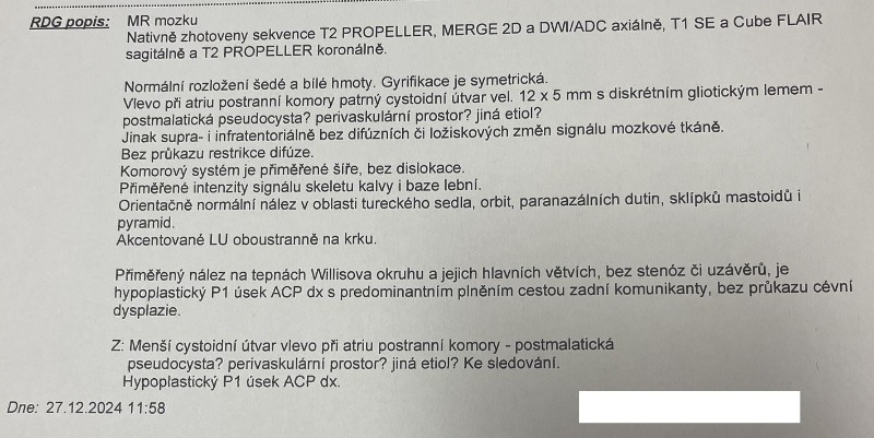 Nález cystoidniho útvaru v levo pri atriu postranni komory magnetickou rezonancí
