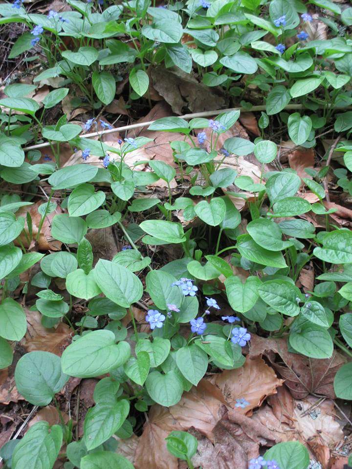 Rostlina s modrým květem, 5 okvětních lístků modrofialové barvy, srdčitý tvar listu