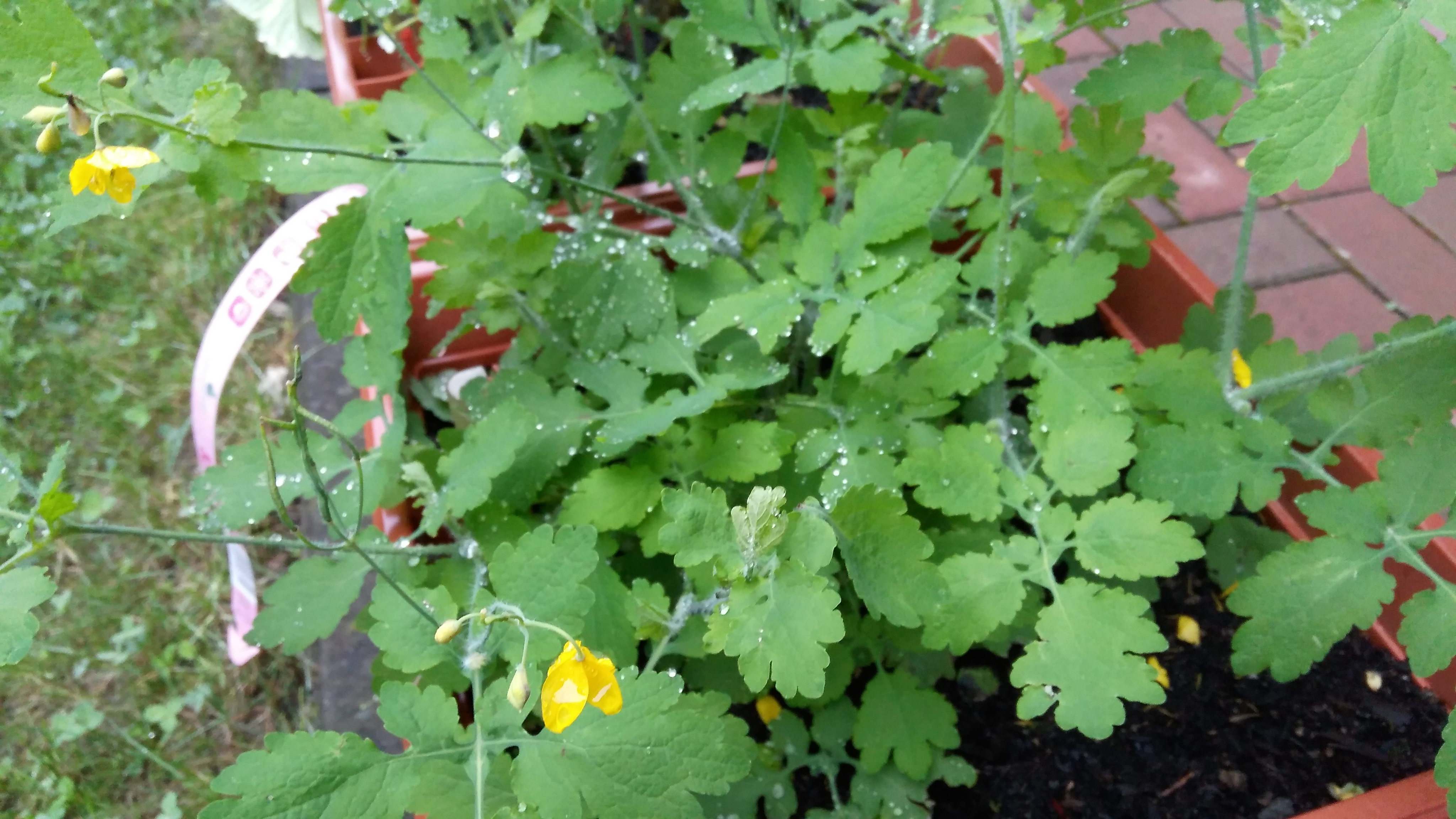 Rostlina se žlutými květy a oranžovým mlékem po zlomení stonku - jméno