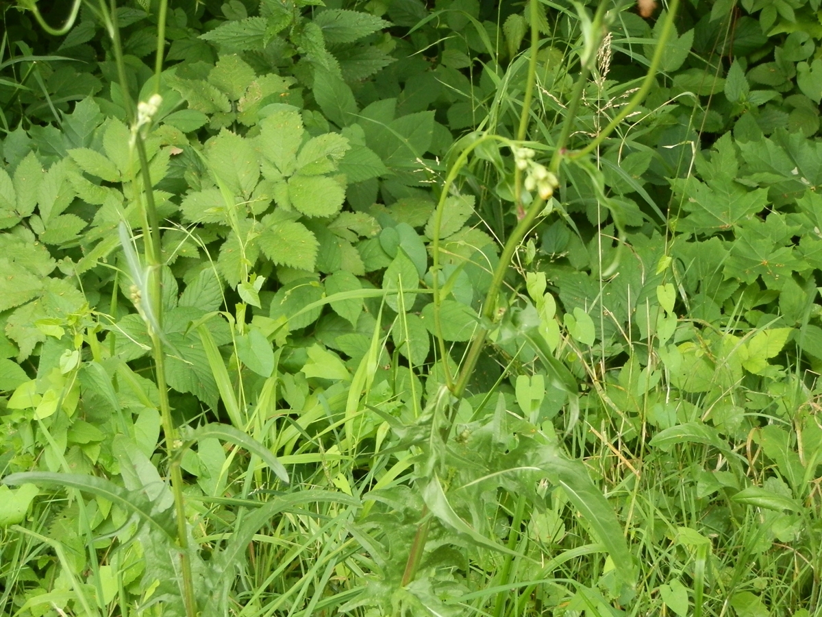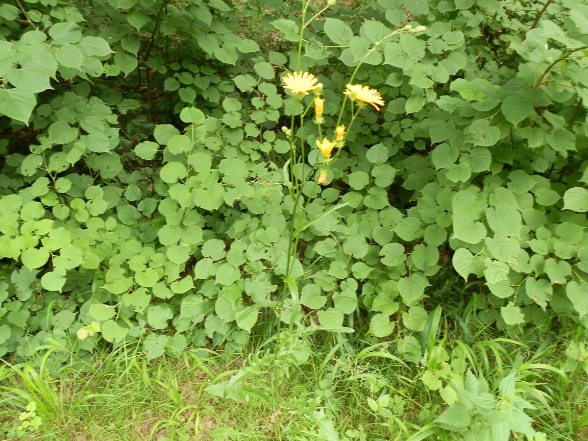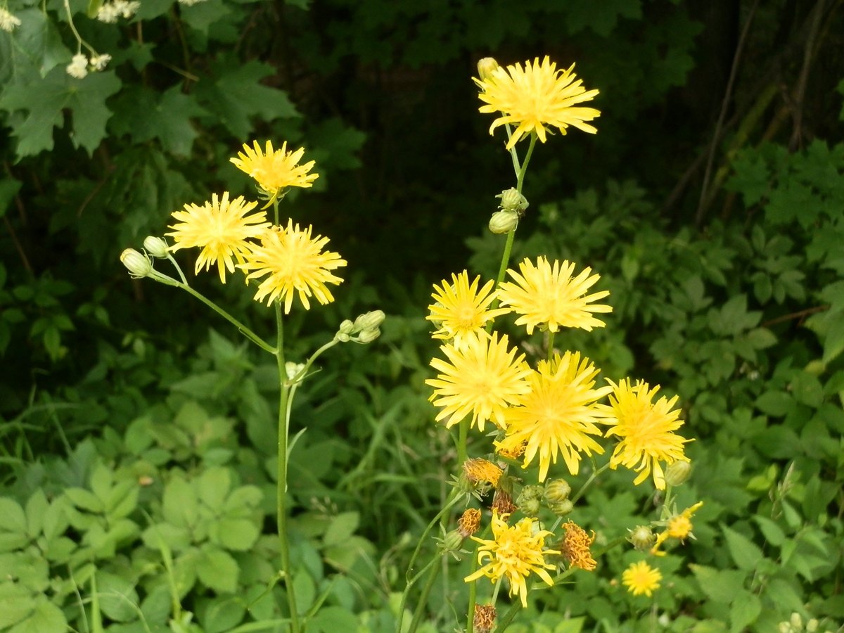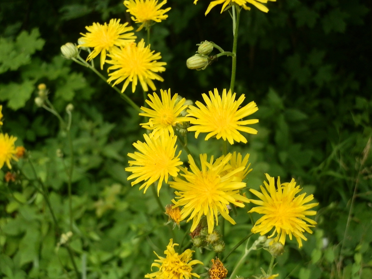- Neznámá rostlina - žlutý květ se spoustou okvětních lístků, hranatý stonek, kracovitý list (škarda dvouletá)