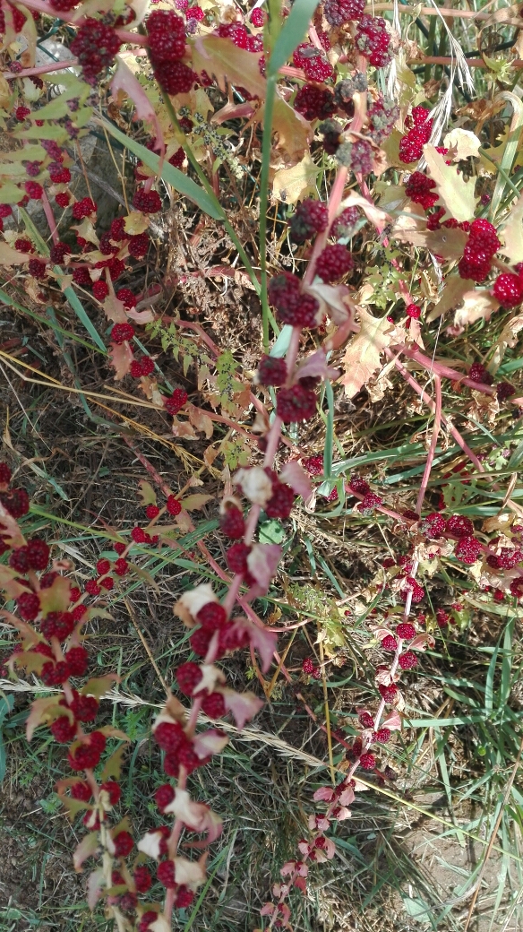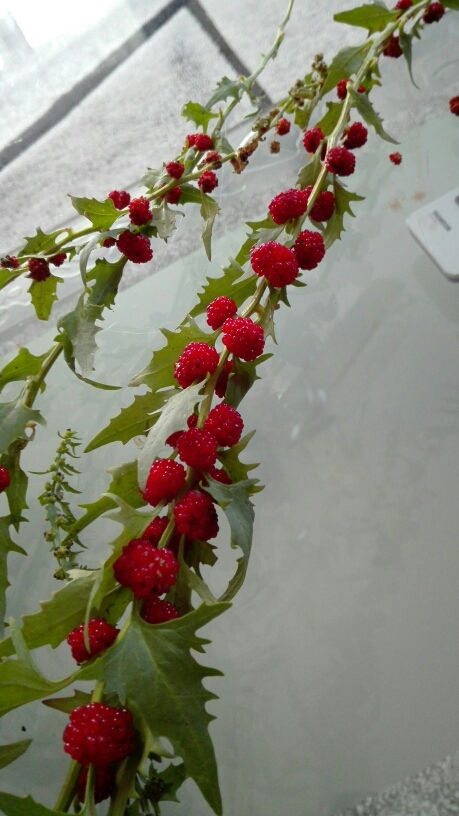 Neznámá rostlina s červenými bobulemi - identifikace podle fotografie (jahodový špenát, Chenopodium foliosum)