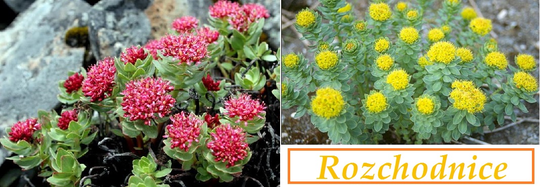 Rozchodnice růžová, Rhodiola rosea (syn. Sedum rhodiola, s. rose a) (obr. 18), je dvoudomá víceletá bylina z čeledi tlusticovitých, Crassu/aceae. Je velmi polymorfní, neboť podle podmínek prostředí se mění její znaky, jako je např. výška rostlin, tvar a velikost listů, počet květů, mohutnost kořenového systému apod. Má masité, tlusté, vodorovné nebo svislé šedobéžové oddenky svíravé chuti se zlatavým nádechem, které jsou na řezu bílé a po usušení růžové. Rostlina vytváří několik nevětvených lodyh 25-50 cm dlouhých, které vyrůstají z chudé listové růžice. Střídavé a přisedlé listy jsou vejčité, obvejčitě podlouhlé až kopinaté. Čepel je sivozelená, dužnatá, celokrajná s několika zuby v horní části a na vrcholu zaostřená. Květenství je hustý mnohokvětý chocholík s jednopohlavnými a zpravidla čtyřčetnými květy. Koruna samčích květů je žlutavá, zelenavá až hnědočervená, u samičích je zakrnělá a téměř se neotevírá. Plodem je měchýřek červené nebo zelené barvy, podlouhle vejcovitá hnědá semena jsou drobná.