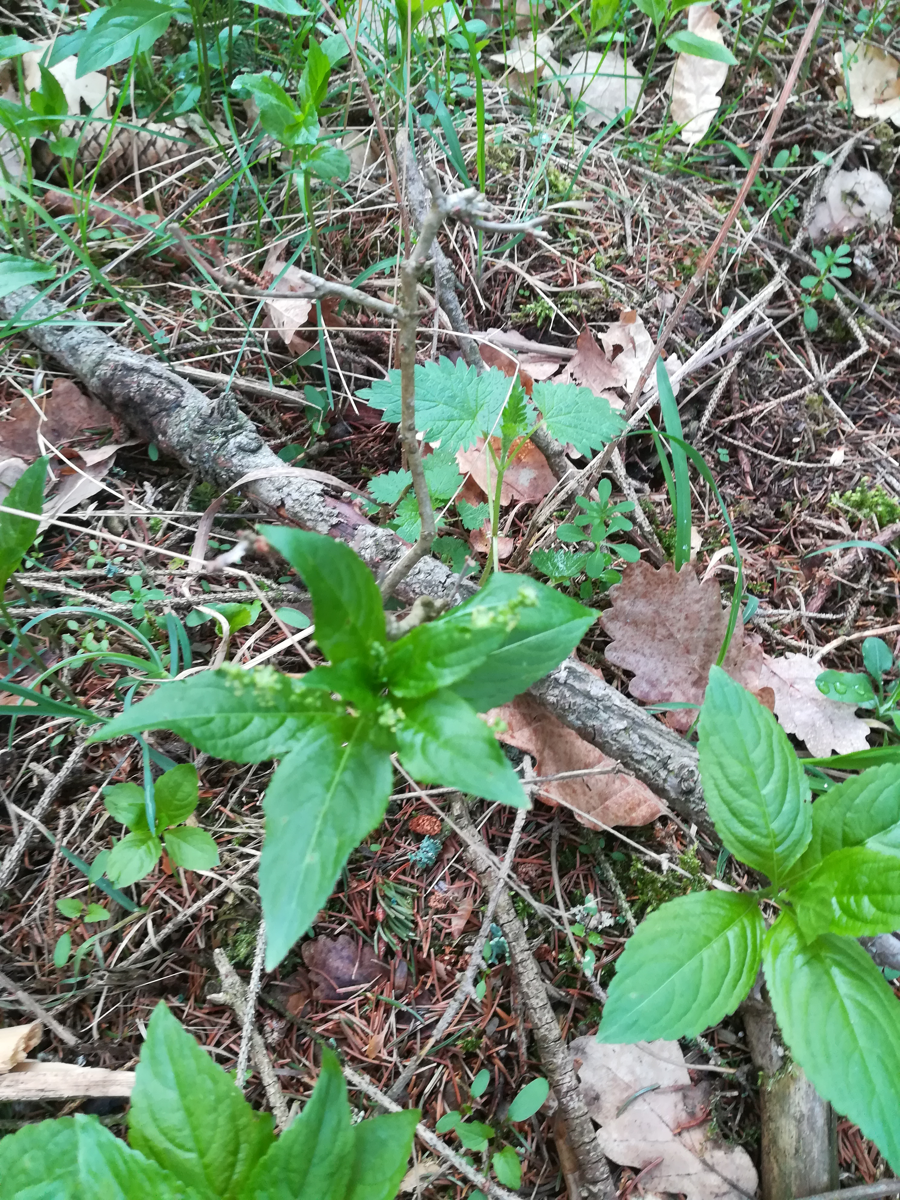 Pak ta špatně zaostřená rostlina zhruba uprostřed bude bažanka vytrvalá (Mercurialis perennis), v pravém dolním rohu nejspíš semenáč netýkavky, plus na obrázku je ještě kopřiva dvoudomá, svízel přítula a nějaký ptačinec. Toho v horním okraji vidím na určení jen malou část…