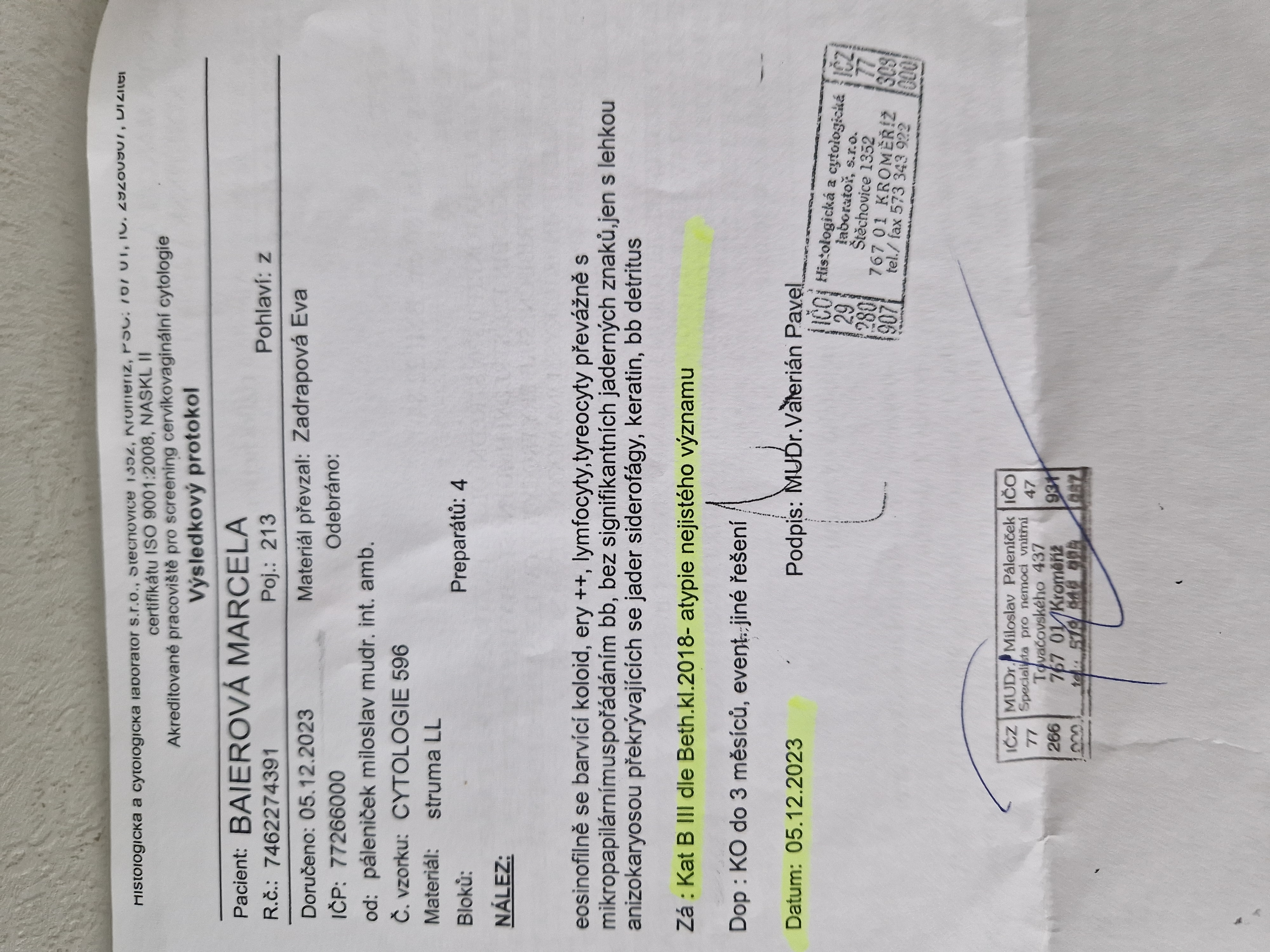 Při prevenci mi našli toto (byla jiz provedena punkce) : vlevo na dolním pólu laloku naseda objemný izoechogenni uzel (uložen již mimo lalok) 28 x 16 mm s jemným lemem, v jeho hloubce je hypoechogenni okrsek 8 x 5 mm z Kat B III dle Bth. kl. 2018 - atypie nejistého významu.