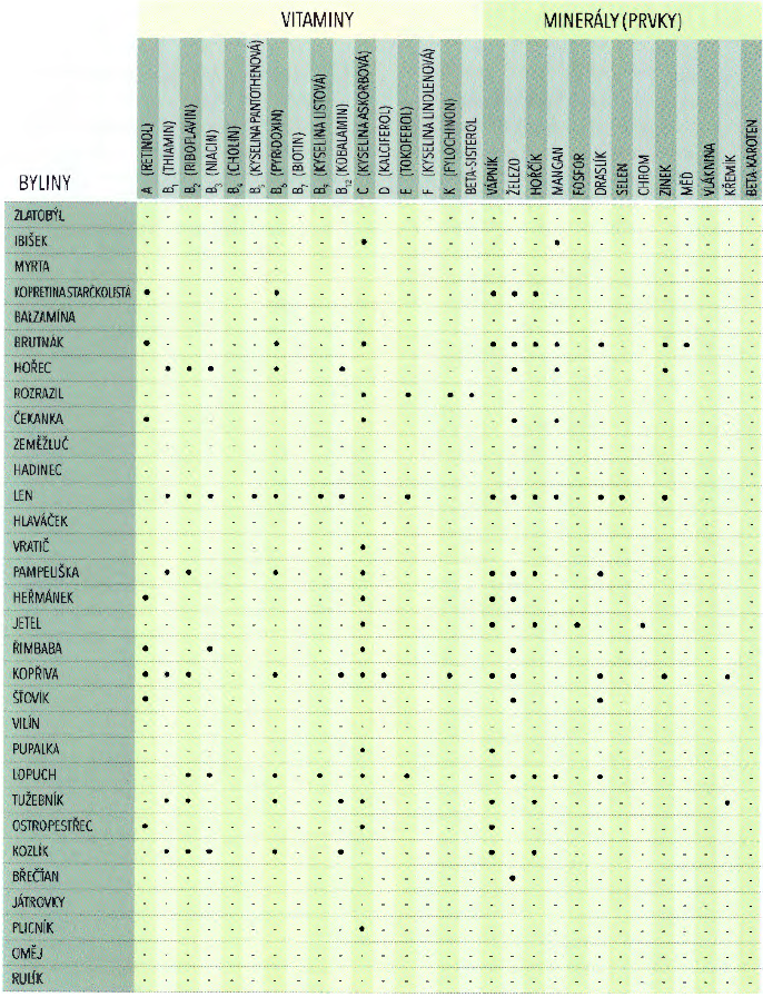 Tabulka vitamínů a stopových prvků (minerálů) obsažených v bylinách