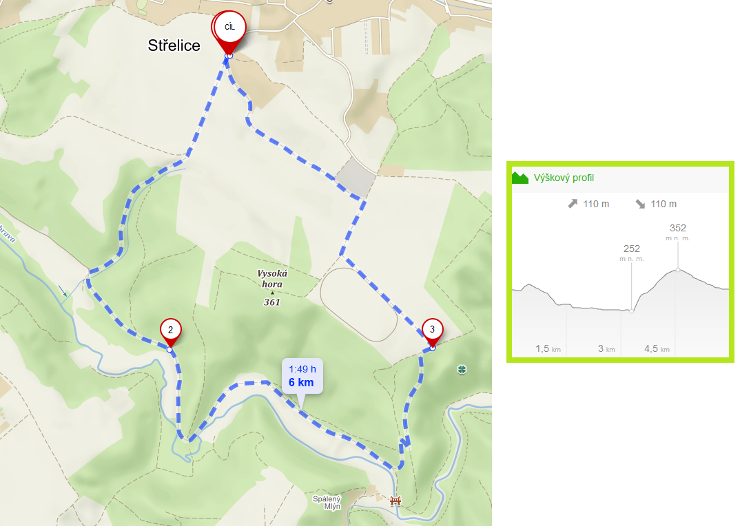 Trasa: trasa kudy půjdeme na mapy.cz je zde (na trase stoupání do kopce, nevhodné pro špatně pohyblivé osoby!) - obrázek mapy trasy vč. výškového profilu (jak moc půjdeme do kopce) je zde.